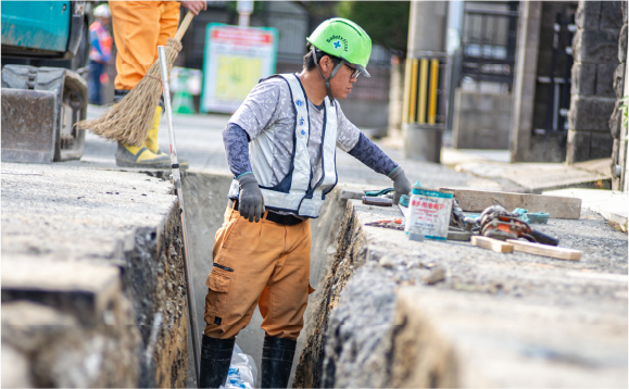 例えば水道管の破裂や漏水、老朽化だけでなく、災害や水害の際にも出動します。「東部水道工事センター」という名称でも事業を行っております。